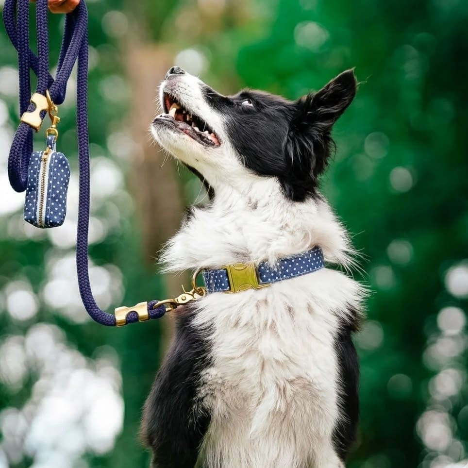 Avec son bleu pétrole profond et ses pois tout en douceur, ce motif signe le look des chiens qui ont clairement pris le lead sur le style à la maison. C’est le détail graphique qui réveille un harnais uni, twiste une balade basique en défilé de rue et fait matcher votre trench comme par hasard. Pensé pour les dog mums et dog dads qui aiment quand ça se voit, mais jamais pour rien : un accessoire fort, assumé, qui reste chic sur tous les pelages.